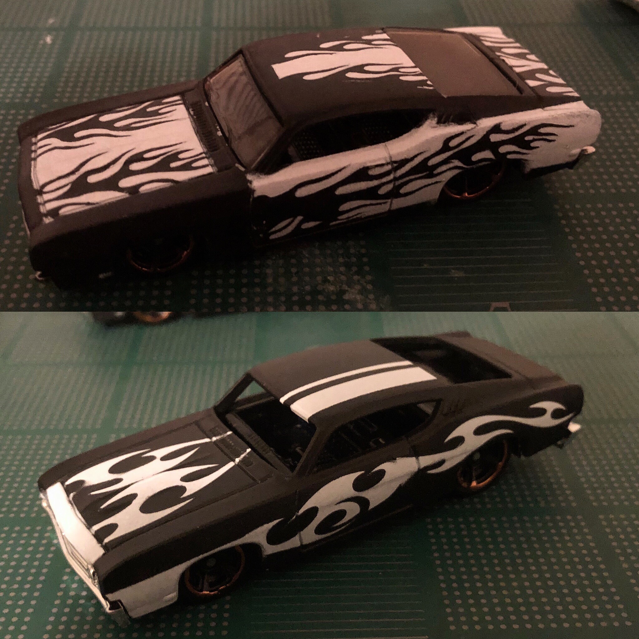 Examples of some underpaints. The second one with the stripes is sitting on a shelf in my office, I have no idea where the first one ended up. Eventually these were covered with transparent candy paint. The white areas turn color, the black areas get glittery.